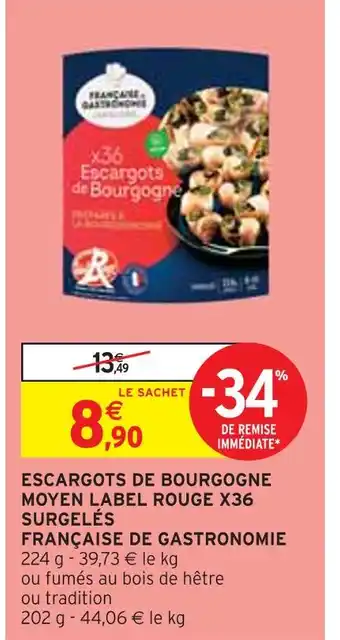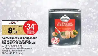 | FRANÇAISE DE GASTRONOMIE ESCARGOTS DE BOURGOGNE MOYEN LABEL ROUGE X36 SURGELÉS | Intermarché | 13,49 € | 8,90 € | 4,59 € Réduction | 18 mars 2024 | 01 avril 2024 | |