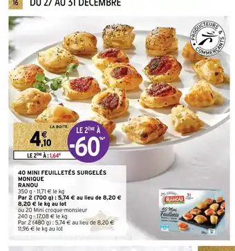 | 40 MINI FEUILLETÉS SURGELÉS MONIQUE RANOU | Intermarché | 7,05 € | 4,15 € | 2,90 € Réduction | 14 mai 2024 | 26 mai 2024 | |