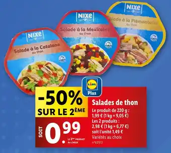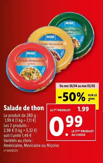 | NIXE Salade au thon | Lidl | 1,99 € | 1,19 € | 0,80 € Réduction | 29 avril 2025 | 07 mai 2025 | |