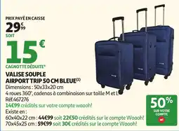 | Valise souple airport trip bleue 50 cm | Auchan | 29,99 € | 15,00 € | 14,99 € Réduction | 21 avril 2026 | 03 mai 2026 | |