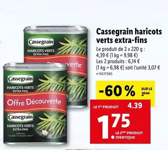 | Cassegrain Haricots Verts Extra-Fins | Lidl | 4,39 € | 1,75 € | 2,64 € Réduction | 05 octobre 2022 | 11 octobre 2022 | |