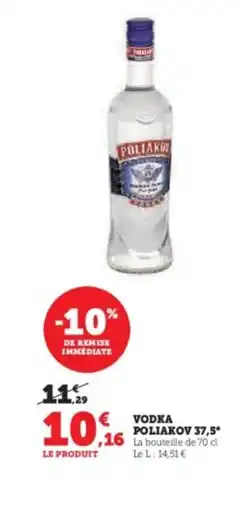 Hyper U POLIAKOV 37.5° Vodka offrePOLIAKOV 37.5° Vodka 70 clHyper U11,20 €10,20 €1,00 € Réduction07 octobre 202512 octobre 2025